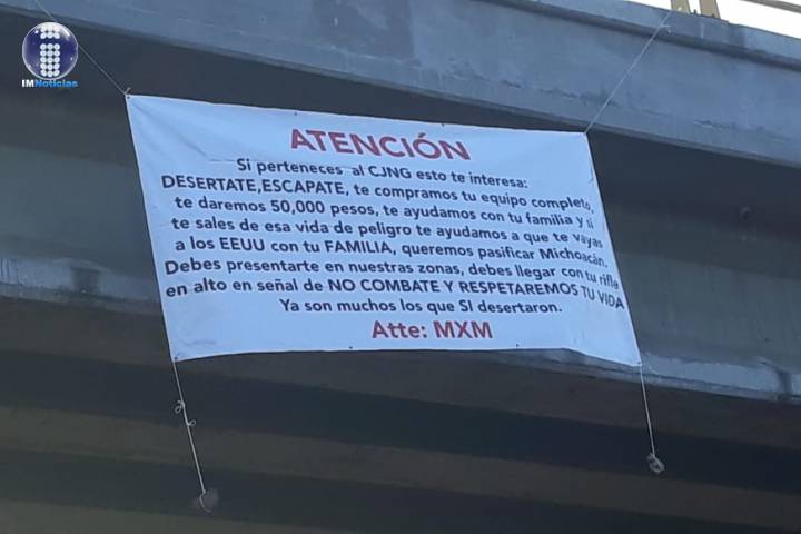 NOTICIAS 17/06/2020Aparecen narcomantas en las que invitan a sicarios de grupo rival a desertarVarias narcomantas fueron colocadas por desconocidos en diversos puntos en Zamora, Lázaro Cárdenas y en Pátzcuaro. En ellas fue escrito un mensaje de invitación para que pistoleros de un grupo criminal de Jalisco deserten y a cambio les ofrecen dinero y salir del país a los Estados Unidos. Los narcomensajes estaban firmados por una célula delictiva rival, según informaron contactos policiacos.