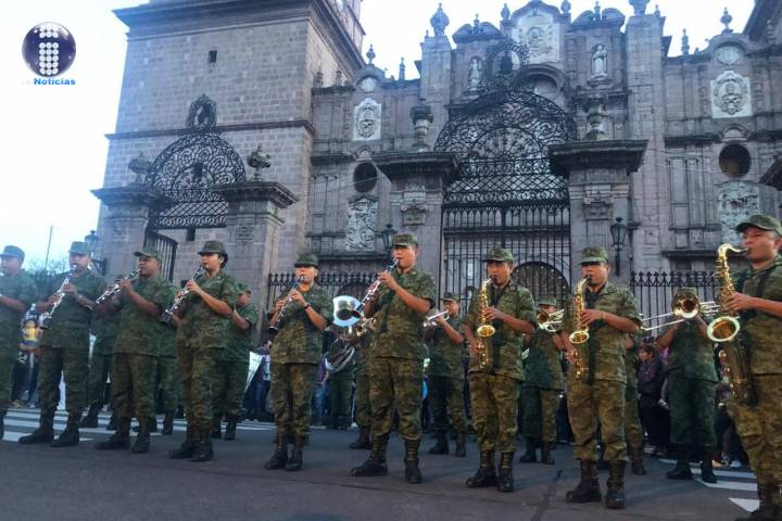 NOTICIAS 13/10/2019Soldados realizan flashmob en el Centro de MoreliaSoldados integrante de la Banda de Música de la XII Región Militar (Irapuato, Gto.), a manera de "Flashmob" entraron por los costados del Centro Histórico hasta posicionarse frente a la Catedral de Morelia, para entonar las melodías "Que lindo es Michoacán, Palomas Mensajeras, Juan Colorado y Caminos de Michoacán".