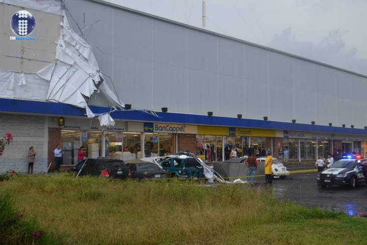 Dos Anuncios espectaculares se cayeron y uno de ellos afectó media docena de vehículos estacionados en un supermercado en el Periférico Paseo de la República en la colonia Paseo de Los Vergeles.