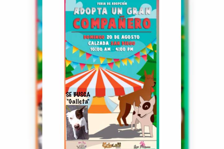 NOTICIAS 18/08/2017Feria de adopción canina el domingo 20 de agosto, en la Calzada San DiegoLa Calzada de San Diego será, por segunda vez, el lugar elegido por animalistas para llevar a cabo una Feria de Adopción Canina, la cual se realizará el domingo 20 de agosto de las diez a las dieciséis horas y en la que se espera superar el número de mascotas que se adoptaron en ese sitio, hace poco más de un mes, donde más de 20 perritos y cuatro gatos, todos rescatados de la calle, encontraron un hogar.