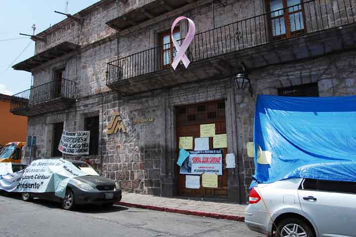 Sin un ofrecimiento continúan integrantes del Sindicato de Trabajadores Descentralizados de Servicios de Salud Lázaro Cárdenas (STDSMM), quienes tienen tomada las oficinas administrativas de la Secretaría de Salud del estado y del Seguro Popular sin afectar citas programadas y atención de urgencias.