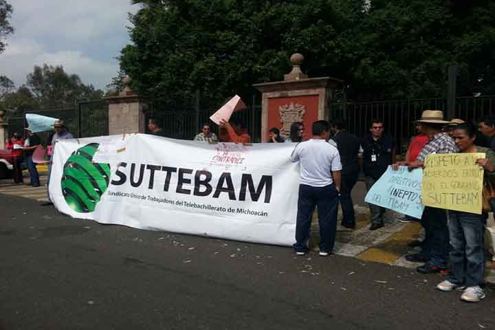 Bajo la advertencia de radicalizar sus acciones, integrantes del Sindicato Único de Trabajadores de Telebachillerato (SUTTEBAM) se manifiestan en las inmediaciones de las oficinas de dicho subsistema.