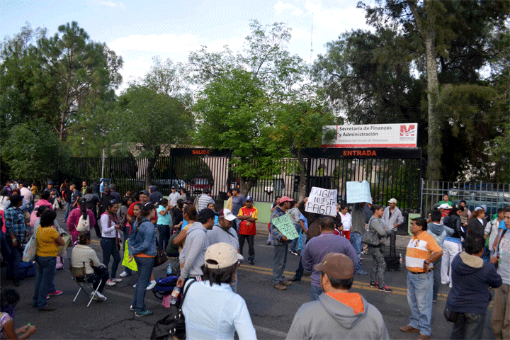 Más de 100 profesores, trabajadores eventuales del gobierno del estado, se manifestaron frente a las oficinas de la Secretaría de Finanzas Estatal, con la petición de que les fueran saldados pagos atrasados.