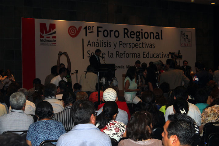 Entre porras y gritos que sentenciaron que "en Michoacán la reforma no pasará" inicio en Morelia el prime Foro Regional de Análisis y Perspectivas sobre la reforma Educativa convocado por la Coordinadora Nacional de Trabajadores de la Educación (CNTE)