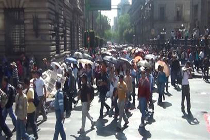 Integrantes de la Coordinadora Nacional de Trabajadores de la Educación (CNTE) marchan de su plantón instalado en el Zócalo capitalino hacia la Secretaría de Gobernación.