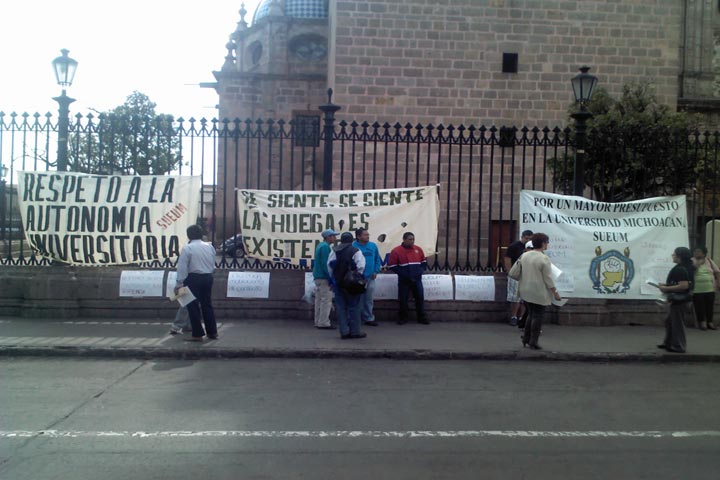 Encabezados por Eduardo Tena, integrantes del Sindicato único de Empleados de la Universidad Michoacana (SUEUM) volvieron a salir a las calles del centro de Morelia para hacer públicas sus demandas y exigir una pronta solución al conflicto que hizo estallar la huelga el pasado miércoles en la Casa de Hidalgo.