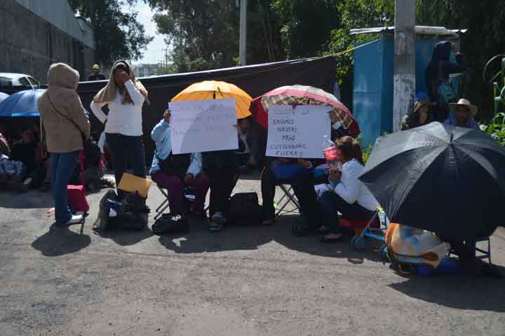 A pesar de la lluvia, un grupo de aproximadamente 50 maestros se manifiesta fuera de las oficinas de la Secretaría de Administración y Finanzas, ubicadas sobre la Ventura Puente.