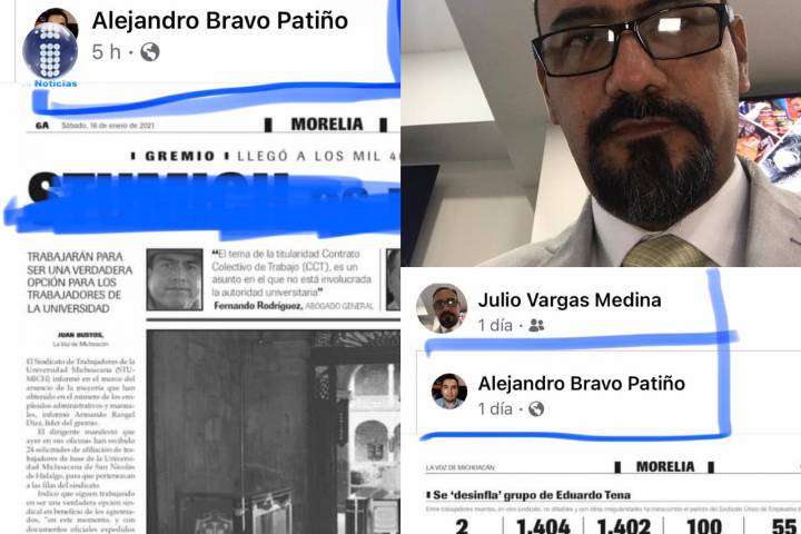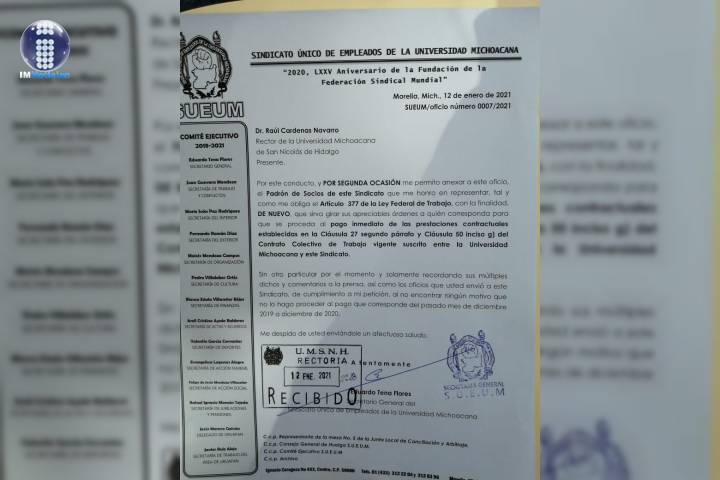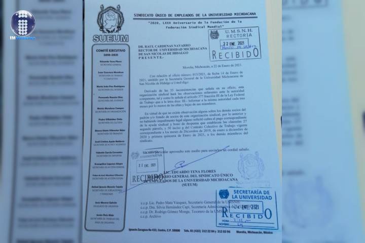 NOTICIAS 18/01/2021Funcionarios universitarios con grandes salarios y violadores de leyes: SUEUMCon salarios por encima de los 50 mil pesos, los funcionarios de la Universidad Michoacana de San Nicolás de Hidalgo dedican su tiempo en involucrarse en la vida interna sindical.