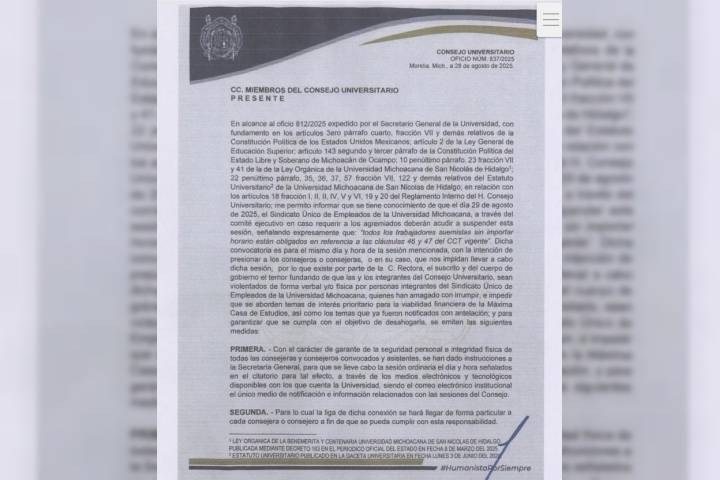 NOTICIAS 10/09/2025En asamblea, SUEUM acuerda emplazar a huelga por violaciones contractuales En asamblea general, integrantes del Sindicato Único de Empleados de la Universidad Michoacana (SUEUM) acordaron emplazar a huelga a la Universidad Michoacana de San Nicolás de Hidalgo por violaciones contractuales para el próximo 2 de octubre a las 19:00 horas.