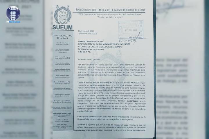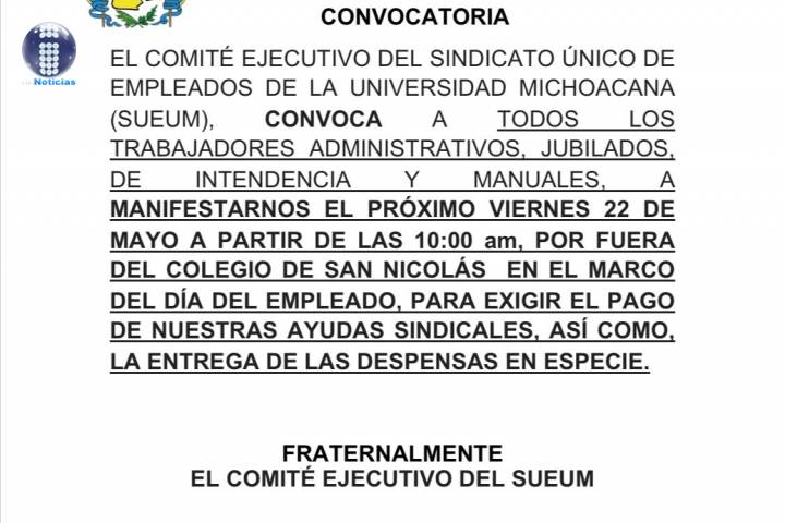 El secretario general del Sindicato Único de Empleados de Universidad Michoacana (SUEUM), Eduardo Tena Flores solicitó a las autoridades universitarias no seguir reteniendo las prestaciones correspondientes a la Ayuda Sindical y Despensa en especie a los agremiados con el pretexto de la actualización del padrón sindical.