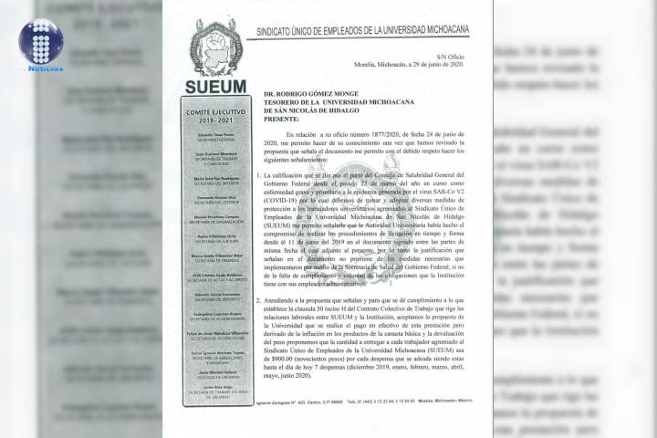 NOTICIAS 03/07/2020Acuerda SUEUM con autoridad nicolaita pago de despensas en efectivo Luego de una fuerte negociación, el Comité Ejecutivo del Sindicato Único de Empleados de la Universidad Michoacana (SUEUM) acordó el pago en efectivo de 7 despensas adeudadas tanto para trabajadores de base y apoyo suemistas.