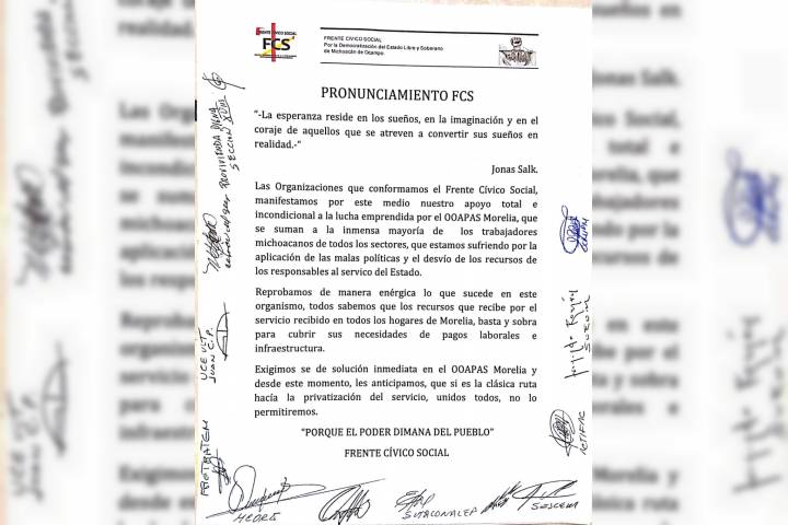 Sin mencionar de qué manera, las 17 organizaciones sindicales que conforman el Frente Cívico Social (FCS) manifestaron su apoyo "total e incondicional" a los trabajadores del Organismo Operador de Agua Potable, Alcantarillado y Saneamiento de Morelia (Ooapas) quienes desde el pasado lunes 18 de junio se encuentran inmersos en una huelga de puertas abiertas que espera el resolutivo por parte de la Junta Local de Conciliación y Arbitraje (JLCy... Ver más...