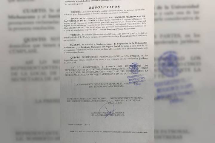 En reunión del Consejo General de Huelga el secretario del Trabajo, Juan Guevara Mendoza informó que la Junta Local de Conciliación y Arbitraje publicó un laudo donde ordena a la UMSNH inscriba a los trabajadores considerados de apoyo al IMSS y al Infonavit y se haga el procedimiento correspondiente con retroactivo a su ingreso a la dependencia.