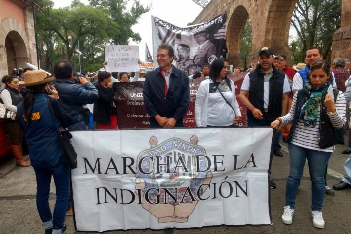 Sindicatos de la Universidad Michoacana de San Nicolás de Hidalgo, se manifestaron este jueves en la capital michoacana, con la Marcha de la Indignación, ante lo que han calificado como ?el nulo actuar de las autoridades nicolaitas'.
