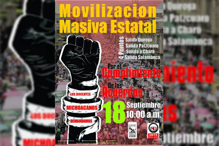 A pesar de que el Gobierno del Estado se reunió con integrantes de la Coordinadora Nacional de Trabajadores de la Educación (CNTE) hace unos dÃas, en contraparte los acuerdos a los que llegaron los agremiados al sindicato en el pleno del pasado miércoles 13 de septiembre, fueron: tomar casetas de peaje, marchar desde cuatro puntos de Morelia, seguir con la toma del edificio de la Secretaria de Educación en el Estado (SEE) y hasta un pos... Ver más...