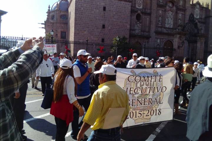 Tras marchas desde Casa de Gobierno, integrantes del Sindicato de Profesores de la Universidad Michoacana (SPUM) arribaron al primer cuadro de la ciudad.