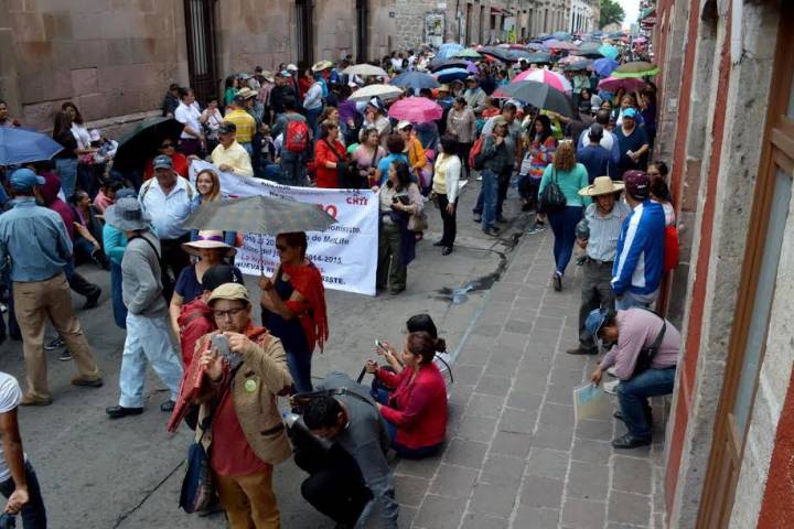 Este viernes miles de docentes adheridos a la Coordinadora Nacional de Trabajadores de la Educación (CNTE) y algunos estudiantes de las Escuelas Normales de Michoacán, se movilizaron en esta capital, marchando desde los distintos accesos a la ciudad para concluir en el Centro Histórico. A la par la Secretaria de Seguridad Pública implemento un fuerte dispositivo para monitorear y mantener el orden social durante la manifestación.