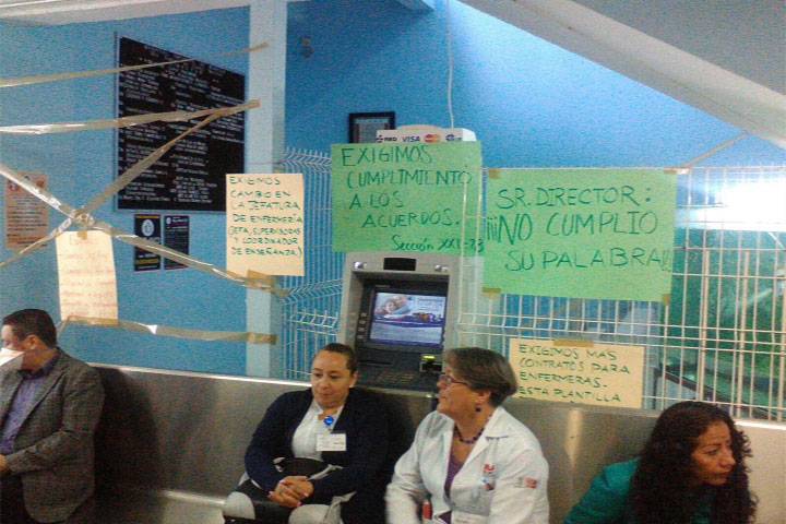 Los manifestamtes acusan al director de no cumplir con los compromisos que había pactado desde noviembre del año pasado con ambos gremios de cambiar a la jefa de enfermeras, Trinidad Ferreyra, por lo que colocaron cartulinas para expresar su molestia y de momento mantienen sin actividad las oficinas administrat... Ver más...