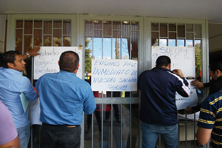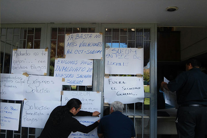 NOTICIAS 15/12/2015Protesta SUEUM ante la falta de pago de la quincena y prestacionesAnte la falta de pago de la primera quincena del mes de diciembre, así como del aguinaldo y prima vacacional, integrantes del Sindicato Único de Empleados de la Universidad Michoacana (SUEUM) se manifiestan en las instalaciones de Rectoría.