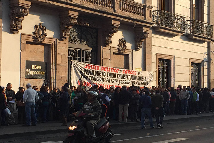 El grupo de manifestantes arribó poco antes de las 11 horas al lugar en el que permanecen obstaculizando el acceso principal al edificio y bloqueando la circulación al tránsito vehicular de la calle Allende.
