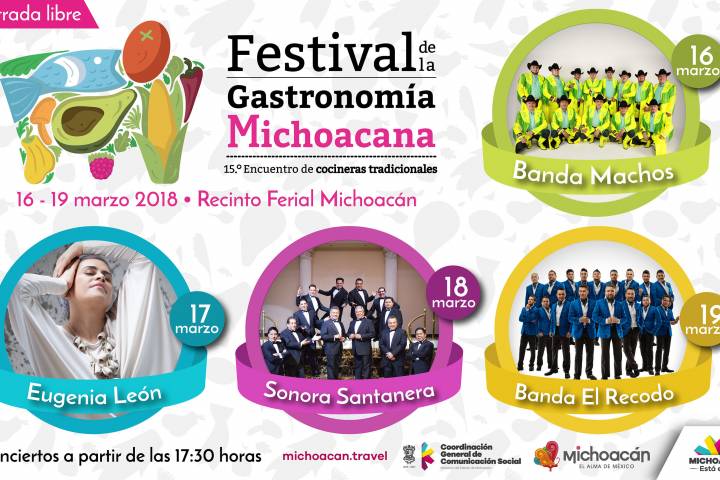 NOTICIAS 12/03/2018Conciertos gratuitos en el Festival de la Gastronomía Michoacana El Festival de la Gastronomía Michoacana, que se llevará a cabo del 16 al 19 de marzo, incluirá las presentaciones gratuitas de La Banda Machos, Eugenia León, La Sonora Santanera y la Banda El Recodo.