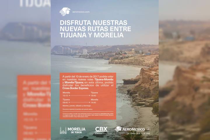 NOTICIAS 30/12/2016Próximamente nueva ruta aérea Morelia-TijuanaLa empresa Aeroméxico anunció su nueva ruta Morelia-Tijuana, que iniciará operaciones el próximo 10 de enero del 2017 con 4 vuelos directos semanalmente y en donde esta nueva oferta de transporte permitirá ofrecer una mayor conectividad a la ciudad con el norte del país.