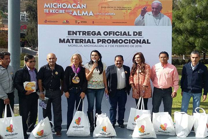 Este domingo la Secretaría de Turismo del Estado en coordinación con hoteles, restaurantes, Ayuntamiento de Morelia y Comisión de Turismo del Congreso del Estado, inició la entrega de materiales promocionales, informativos y souvenirs a diversos giros empresariales relacionados con el sector turístico, para distribuirse a los visitantes que recibirá la ciudad en el marco de la próxima visita del Papa Francisco.