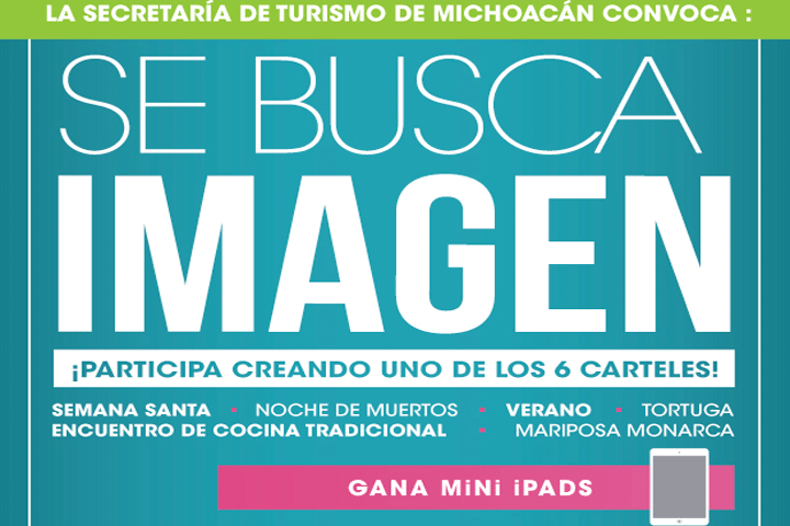 NOTICIAS 10/02/2014En busca de carteles que muestren campañas de MichoacánCon la finalidad de encontrar la mejor imagen y diseño para las 6 diferentes campañas de promoción del Estado con las que se pretende posicionar los diferentes atractivos michoacanos en el territorio michoacano y estados circunvecinos asà como en el mercado nacional, canadiense y norteamericano, la SecretarÃa estatal de Turismo lanza la convocatoria al público en general para participar en el concurso "Se busca imagen"