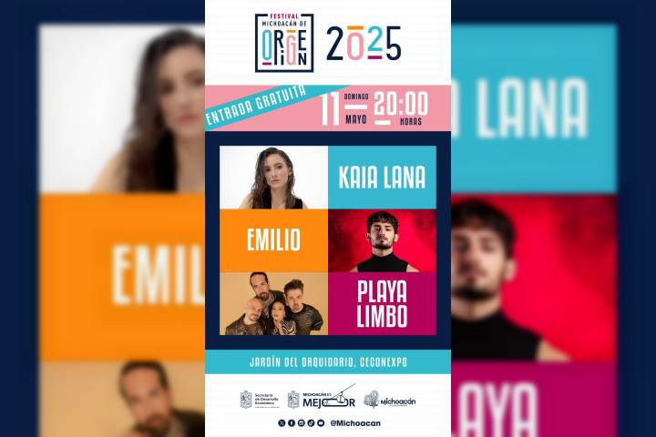 NOTICIAS 08/05/2025Playa Limbo, Emilio Osorio y Kaia Lana, este domingo en el Festival Michoacán de OrigenLos conciertos y espectáculos del Festival Michoacán de Origen continúan este fin de semana. El domingo 11 de mayo, Playa Limbo, Emilio Osorio y Kaia Lana, serán los encargados de animar al público asistente.