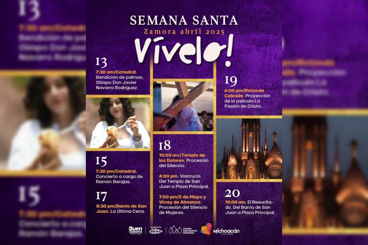 NOTICIAS 14/04/2025Vive las actividades de Semana Santa en ZamoraZamora está lista para las actividades que desarrollará para el turismo religioso en esta temporada de Semana Santa, informó la Secretaría de Turismo de Michoacán (Sectur), encabezada por Roberto Monroy García.