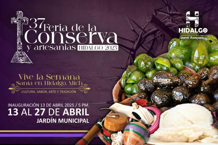 NOTICIAS 08/04/2025Feria de la Conserva de Hidalgo, del 13 al 27 de abril La edición 2025 de la Feria de la Conserva de Hidalgo se desarrollará del 13 al 27 de abril, en el marco de la Semana Santa, informó la Secretaría de Turismo de Michoacán (Sectur), encabezada por Roberto Monroy García.