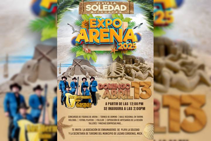 NOTICIAS 09/04/2025Expo Arena, este fin de semana en Playa La Soledad Playa La Soledad, en Lázaro Cárdenas, realiza este fin de semana la edición 2025 de la Expo Arena, donde se reunirán turistas y visitantes para el concurso de figuras de arena y futbol playero, entre otras actividades, informó la Secretaría de Turismo de Michoacán (Sectur), que encabeza Roberto Monroy García.