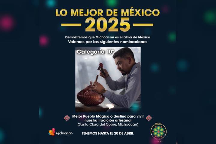 NOTICIAS 22/03/2025Por su tradición artesanal, Santa Clara del Cobre es nominado como Mejor Pueblo Mágico de MéxicoPor su tradición artesanal, Santa Clara del Cobre compite a nivel nacional como Mejor Pueblo Mágico en los premios "Lo Mejor de México" que realiza este año la revista especializada en turismo México Desconocido.