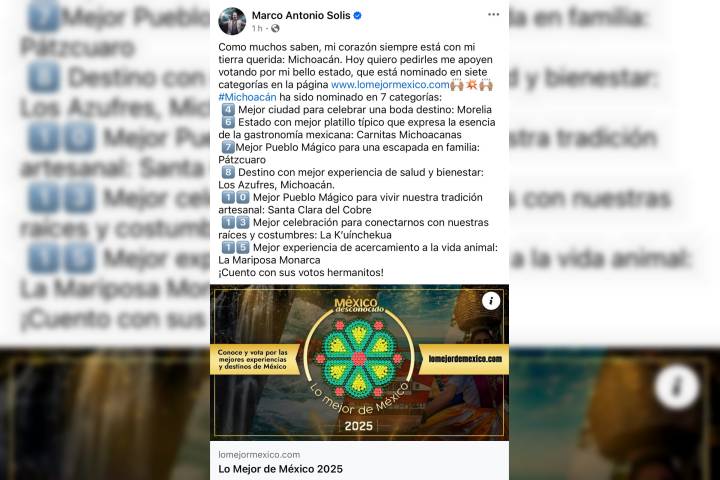 NOTICIAS 26/03/2025El Buki demuestra su amor por Michoacán e invita a apoyar al estado Como lo dice en su canción, Michoacán es su nido, y por ello Marco Antonio Solís se suma al llamado para votar por "el alma de México", en los premios nacionales donde compite en siete categorías.