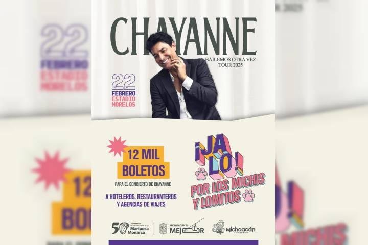 NOTICIAS 13/02/2025¡Jálate por tus boletos para Chayanne! Aún hay en hoteles y restaurantesChayanne está por llegar a Michoacán para reencontrarse con sus hijas e hijos. La cita para su concierto gratuito, que presenta el Gobierno de Michoacán, será el próximo sábado 22 de febrero, minutos después de las 20:00 horas en el Estadio Morelos.