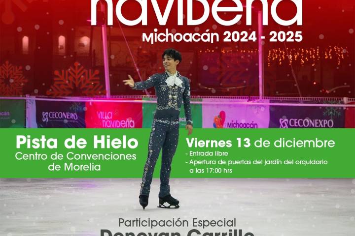 NOTICIAS 12/12/2024Asà será la dinámica para el espectáculo sobre hielo de Donovan Carrillo en la Villa Navideña Donovan Carrillo Suazo, el patinador artÃstico sobre hielo considerado como uno de los mejores del mundo, llega este viernes 13 de diciembre a la pista de hielo de la Villa Navideña que el Gobierno de Michoacán ha preparado en el Centro de Convenciones y Exposiciones de Morelia (Ceconexpo).