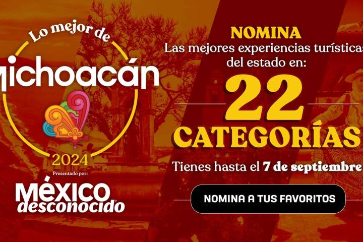 El tiempo se agota y Michoacán requiere de ti para demostrar porqué es el Alma de México. Este sábado 7 de septiembre cierra la etapa de postulación a los premios "Lo Mejor de Michoacán", que organiza la revista México Desconocido en colaboración con la Secretaría de Turismo del Estado. Sí te preguntas ¿qué son los premios," Lo Mejor de Michoacán"? Estos galardones creados en 2017 por México Desconocido, medio turístico líder e...