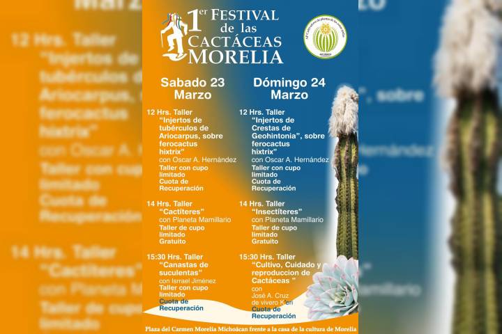 El primer Festival de las Cactáceas se desarrolla en la capital michoacana presentando al público talleres, exposición y venta de plantas, pláticas y la presencia de productores de todo el país. Del 21 al 24 de marzo, la sede del encuentro es la plaza del Carmen, ubicada a un costado de la Casa de la Cultura de Morelia y desde el primer día de actividades ha logrado atraer a un amplio público de distintas edades. El primer Festival d...