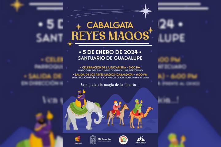 NOTICIAS 04/01/2024Reyes Magos llegarán al Pueblo Mágico de PátzcuaroEste viernes 5 de enero se llevará a cabo la tradicional cabalgata de Reyes Magos en Pátzcuaro, a partir de las 17:00 horas, asà lo anunció Roberto Monroy GarcÃa, secretario de Turismo de Michoacán, quien extendió la invitación para que la población acuda a este Pueblo Mágico y disfrute de este excepcional evento.