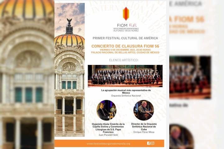 NOTICIAS 09/12/2022Con presencia en el Palacio de Bellas Artes, concluye hoy el Festival Internacional de Órgano de MoreliaEste viernes, la Ciudad de México recibe al Festival Internacional de Órgano de Morelia en el majestuoso Palacio de Bellas Artes y con esta presentación termina la quincuagésima sexta edición del Festival Internacional de Órgano de Morelia, considerado como el más importante de su ramo en el mundo.
