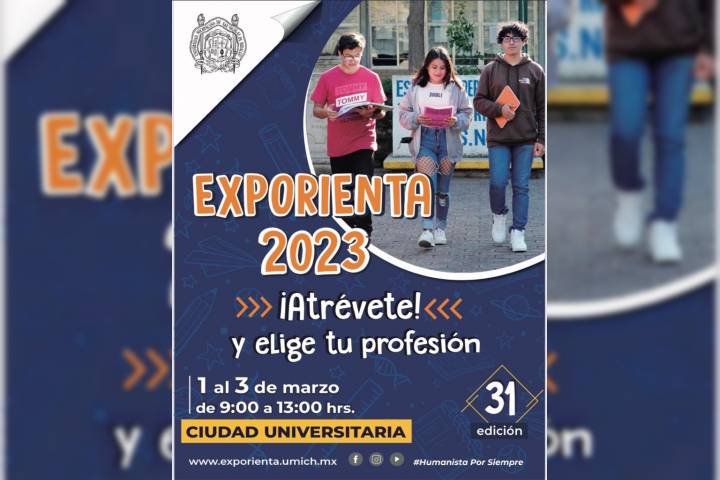 NOTICIAS 18/02/2023Cada vez más cerca la "ExpOrienta, atrévete a elegir" de la UMSNH La "ExpOrienta, atrévete a elegir", que organiza la Universidad Michoacana de San Nicolás de Hidalgo (UMSNH), está cada vez más cerca, y espera la asistencia de miles de jóvenes quienes están próximos a elegir su carrera.