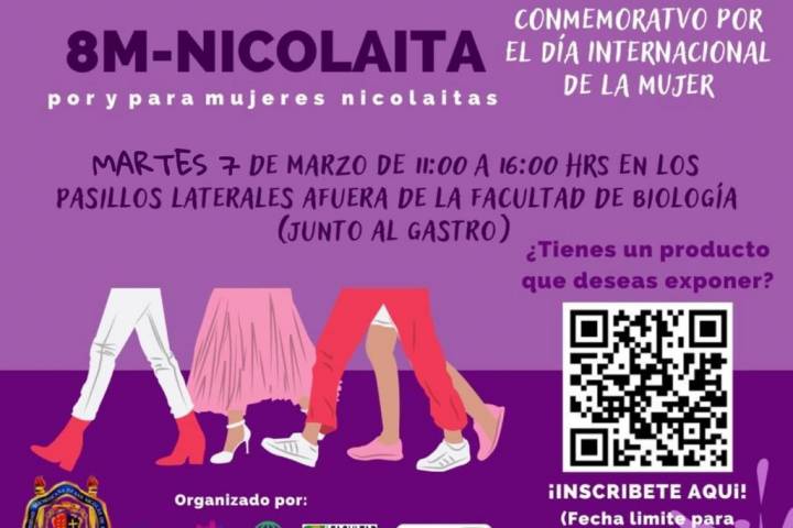 NOTICIAS 25/02/2023Universitarias emprendedoras y profesoras realizan el Bazar 8M-Nicolaita Estudiantes emprendedoras y profesoras de la Universidad Michoacana de San Nicolás de Hidalgo (UMSNH), realizarán el Bazar 8M-Nicolaita, el próximo 7 de marzo en las instalaciones de Ciudad Universitaria, con el fin de impulsar el emprendimiento y de tejer redes de apoyo entre mujeres.