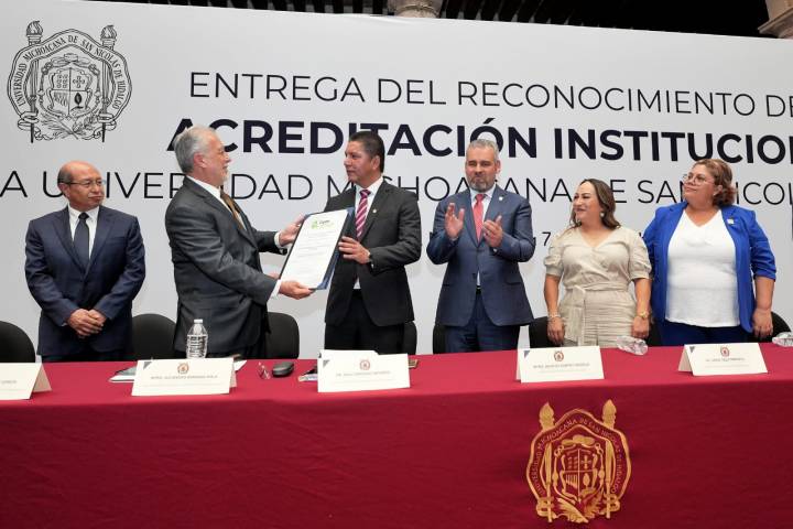 El Rector de la Universidad Michoacana de San Nicolás de Hidalgo, Raúl Cárdenas Navarro, recibió el dictamen de Acreditación Institucional con el que la UMSNH refrenda su compromiso social y la calidad y excelencia de sus programas académicos. Durante el acto protocolario celebrado en el Colegio Primitivo y Nacional de San Nicolás de Hidalgo, donde estuvo acompañado por el gobernador Alfredo Ramírez Bedolla, la presidenta del DIF, Gr...
