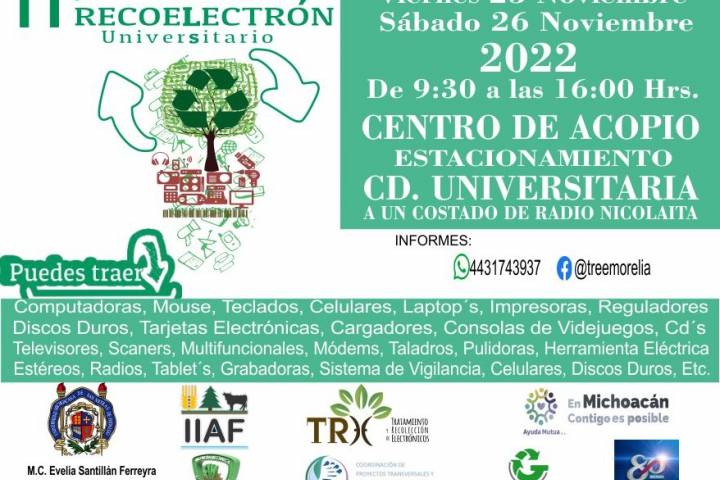 La Universidad Michoacana de San Nicolás de Hidalgo (UMSNH), informa que este viernes y sábado realizará el Recoelectrón Universitario que en este 2022 llega a su onceava edición. Esta actividad tiene como objetivo de mejorar las prácticas en el tema de responsabilidad social y ambiental, por ello, la Universidad Michoacana hace una cordial invitación para que lleven sus residuos de aparatos eléctricos y electrónicos al centro de acop...