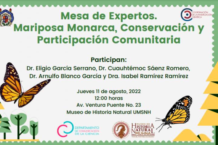 La Universidad Michoacana de San Nicolás de Hidalgo (UMSNH), a través del Museo de Historia Natural (MUHNA) y del Departamento de Comunicación de la Ciencia, celebrará el próximo 11 de agosto mesa de expertos entre investigadores con el tema "Mariposa Monarca, Conservación y Participación Comunitaria". El presente ejercicio dialógico se realizará luego de que el pasado 21 de julio se divulgó la alerta por la incorporación de la Ma...