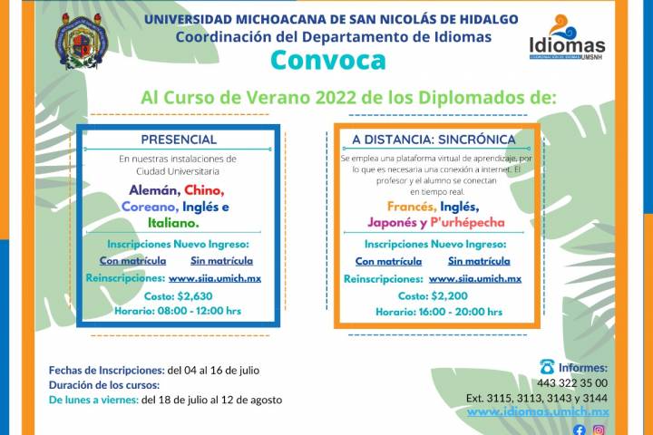 La Coordinación del Departamento de Idiomas de la Universidad Michoacana de San Nicolás de Hidalgo (UMSNH) convoca a la comunidad nicolaita y público en general interesado en estudiar alguna lengua diferente al español, a inscribirse a los cursos de verano 2022 que inician el próximo mes de julio. Los idiomas disponibles para este verano son: alemán, chino, coreano, inglés e italiano que se imparten en modalidad presencial, y los idiom...