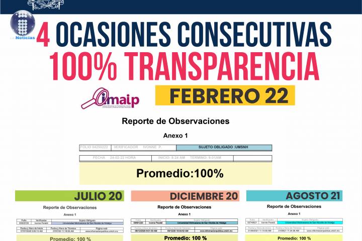 NOTICIAS 28/02/2022Tras revisión sorpresa del IMAIP la UMSNH vuelve a obtener calificación de 100% de transparencia El Instituto Michoacano de Transparencia, Acceso a la Información y Protección de Datos Personales (IMAIP) concluyó que la Universidad Michoacana de San Nicolás de Hidalgo (UMSNH) obtuvo el 100 por ciento de cumplimiento en materia de transparencia en la primera evaluación de 2022.