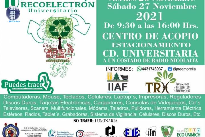 NOTICIAS 26/11/2021Inicia el décimo recoelectrón en Ciudad UniversitariaLa Universidad Michoacana de San Nicolás de Hidalgo (UMSNH) puso a disposición de la ciudadanía el centro de acopio de aparatos eléctricos y electrónicos en desuso, como parte del 10º Recoelectrón Universitario, el cual cumple 10 años en la presente edición.