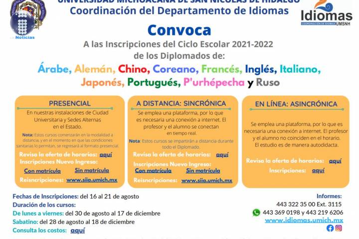 NOTICIAS 17/08/2021Abierta convocatoria de idiomas en la UMSNH La Coordinación del Departamento de Idiomas de la Universidad Michoacana de San Nicolás de Hidalgo (UMSNH), informa que esta semana inició con el periodo de inscripciones para los interesadas en estudiar una lengua diferente al español durante el próximo ciclo escolar.