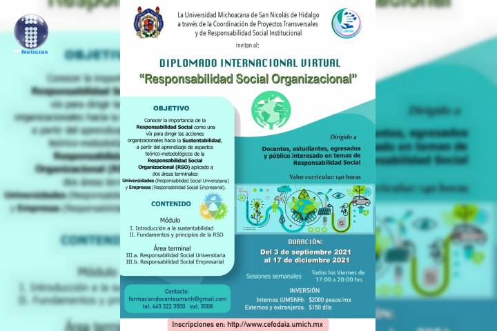 NOTICIAS 31/08/2021UMSNH ofrece diplomado internacional en Responsabilidad Social Organizacional